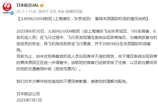 7月1日,日本航空公司发布JL8696/IJ004航班 (上海浦东-东京成田) 备降关西国际机场的情况说明:2025年6月30日,JL8696/IJ004航班(由上海浦东飞往东京成田,185名乘客,6名机组人员)在飞行过程中,飞行员发现增压系统出现异常指示,为确保旅客与机组成员的安全,将飞机降低到安全飞行高度,并于20时48分在关西国际机场备降。