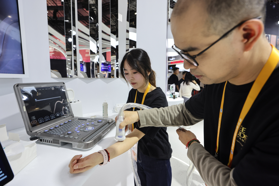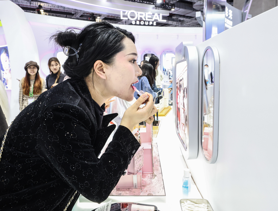图为雅诗兰黛集团展位上,观众正在体验一款在进博现场首发的皮肤分析仪。