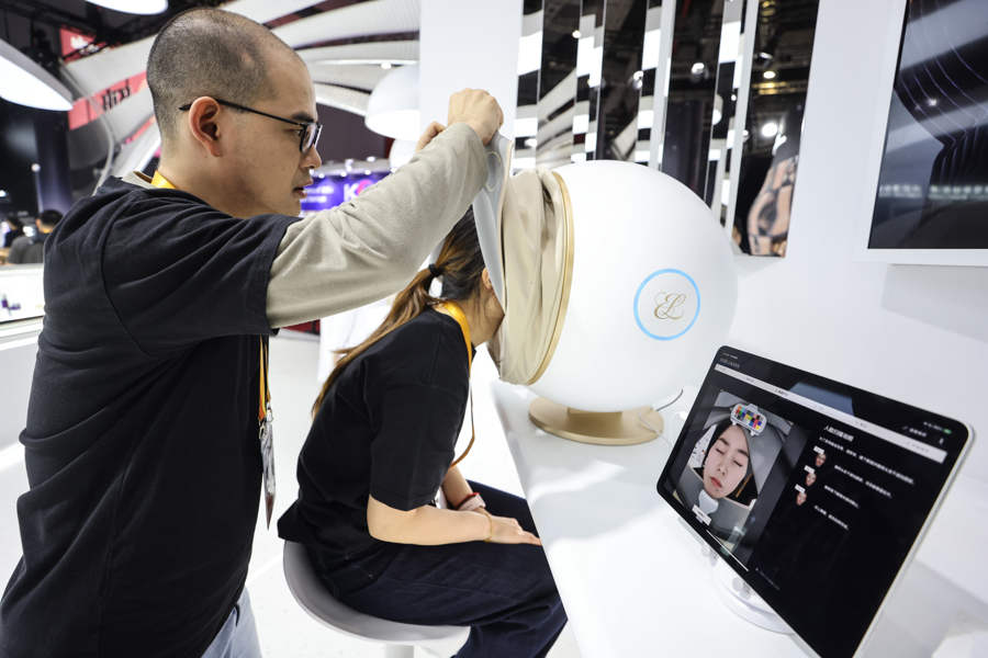 图为雅诗兰黛集团展位上,观众正在体验一款在进博现场首发的AI皮肤检测仪。